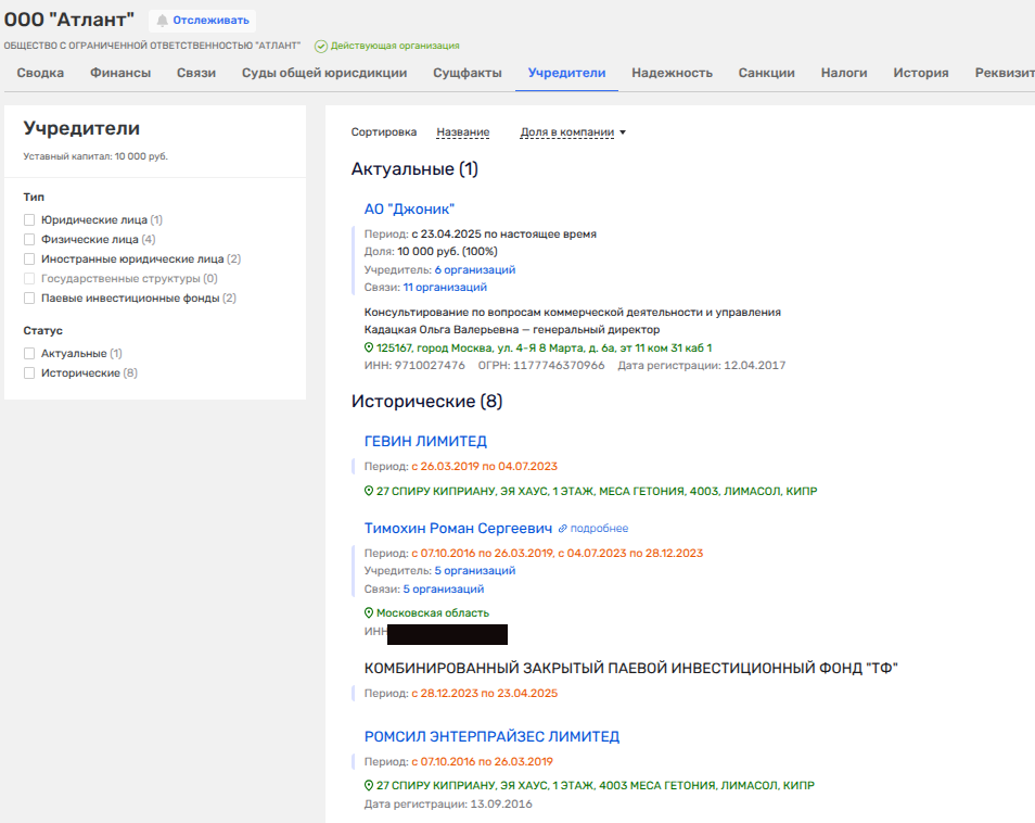 Что интересно: через Ольгу Кадацкую и ООО ТПУ «Ховрино» (еще один бывший госактив), коим владеет ООО «Атлант», где директором снова Кадацкая, мы выходим не только на всё того же Тимохина, но и кипрские кубышки, с которыми он по этим фирмам пересекался. Среди таковых - ГЕВИН ЛИМИТЕД и РОМСИЛ ЭНТЕРПРАЙЗЕС ЛИМИТЕД. Подобные партнеры толсто намекают на вывод средств из России, который мог иметь место с подачи любимчика Собянина.