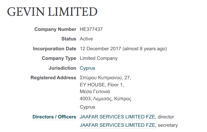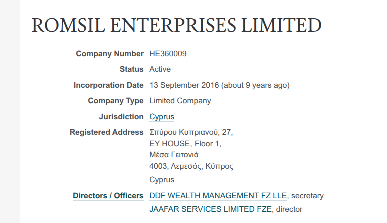 При этом обе фирмы - действующие, руководит ими некая техническая кубышка - JAAFAR SERVICES LIMITED FZE. Эта фирма управляет еще пятью фирмами, которые были созданы примерно в те же годы, что Ромсил и Гевин, и, вероятно, могут иметь отношение к тем же бенефициарам, - SEMEAN LIMITED, FELER LIMITED, PRODUS LIMITED, NORLIA LIMITED, RENIL LIMITED.