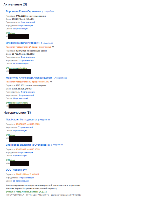 В ООО «Левел Груп» долю имеют всё та же директор СЗ «Дубининская 59» Воронина, директор всего дивизиона Игнахин и Александр Меркулов - директор по девелопменту Level Group. С 24 июля 2025 года Мошковича в числе владельцев скрывают. Таким образом, он, став токсичным, попытался дистанцироваться от активов, но в то же время снимает сливки с проектов и вовсе не вышел из них.