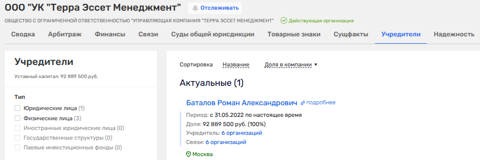 Среди юрлиц Баталова есть и ООО «УК «Терра Эссет Менеджмент», которое управляет активами, в том числе через такую надстройку для сокрытия бенефициаров как ЗПИФ.