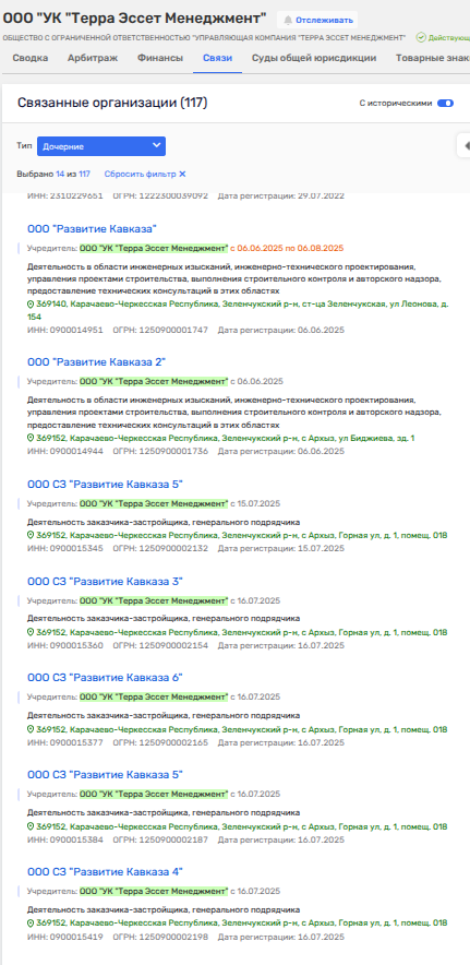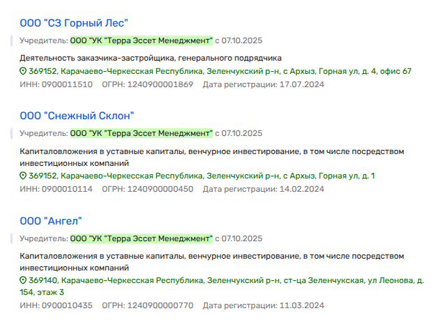 При этом за июнь-июль 2025 года то же УК Баталова наштамповало пачку специализированных застройщиков, у которых отличался лишь номер - ООО СЗ «Развитие Кавказа номер такое-то». Все компании прописаны по адресу горнолыжного курорта «Архыз», оформлены на ЗПИФ, коими управляет компания Баталова.