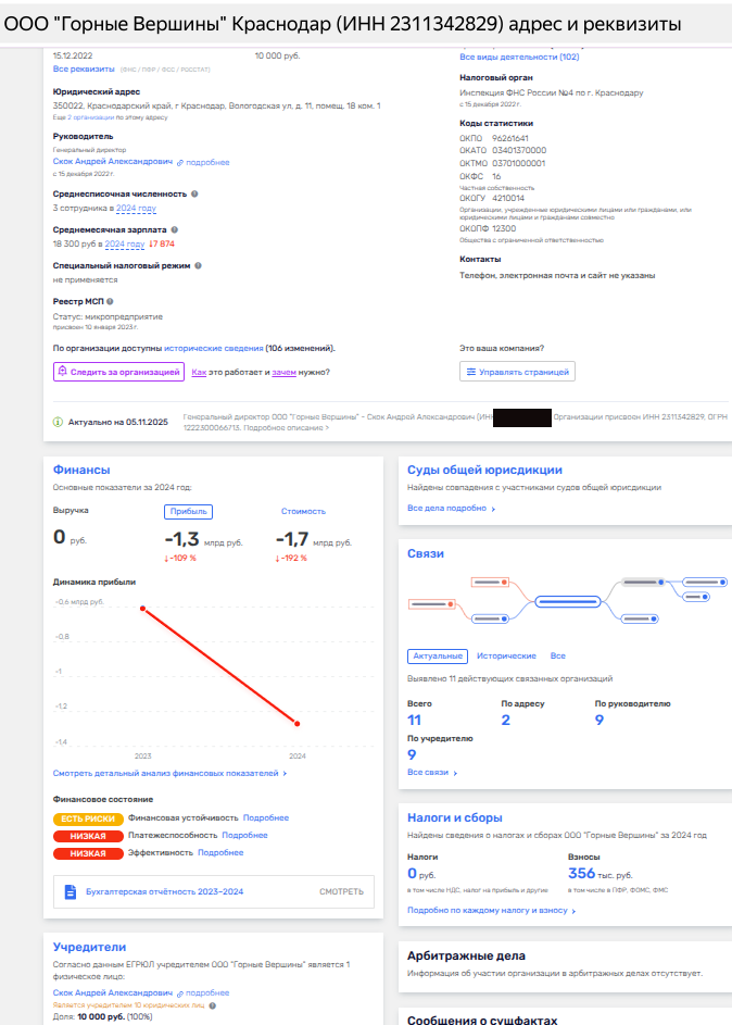 Дело в том, что ООО «Горные вершины» - это не более чем ширма в хрусткой упаковке. Создана она в декабре 2022 года, незадолго до торгов, с уставным капиталом 10 тыс. рублей. В штате до сих пор лишь три сотрудника, а по результатам 2024 года убыток был 1,3 млрд рублей против 609 млн рублей убытка годом ранее. Казалось бы, откуда у такой мутной компании аж 24 с лишним миллиарда на покупку акций курорта?