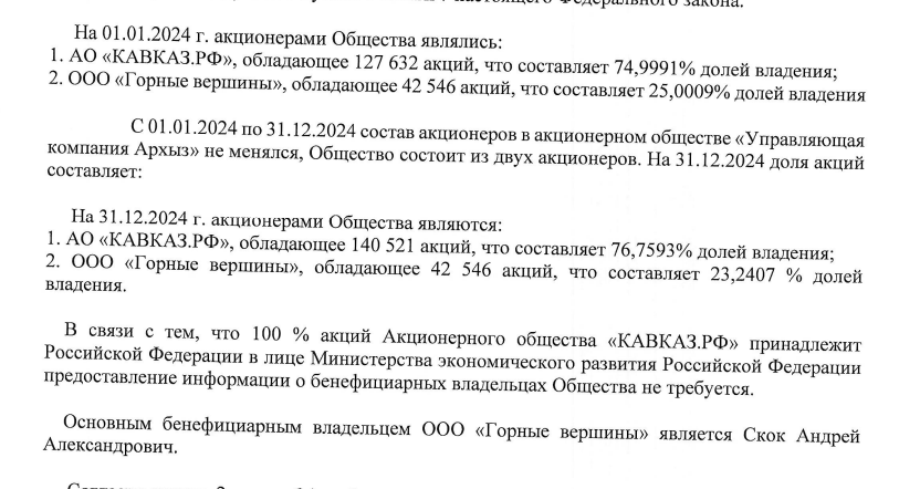 На конец 2024 года государственному АО «Кавказ.РФ» принадлежит в УК более 76,7% акций, а компании «Горные вершины» -23,2%. Подобный расклад получился при докапитализации. Читай - довливании бюджетных активов в УК.