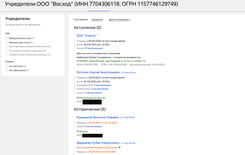 1 октября 2025 года из числа владельцев ООО «Восход» вышел армянский олигарх Рубен Варданян, который с 2022 года не является гражданином России. От гражданства этот ушлый торгаш отказался, а денежки слил доверенным лицам и в семейный фонд. Это намекает на то, что от российских денег этот экс-глава правительства Нагорно-Карабахской республики отказываться не намерен. Главное прикрыть всё ширмой из доверенных лиц и не забыть наговорить красивых слов, выступив эдаким «парнем-рубахой».