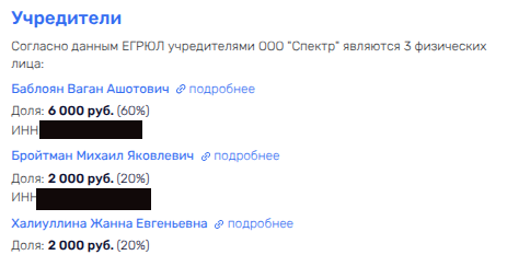 Директором ООО «Спектр» является Мария Шабанова, которая также руководитель - ООО «Энди Рус». Там же ей принадлежит копеечная доля, а основной владелец - ЗАО «НЮ ДАЙМЕНШН» из Армении. Бенефициара последнее не раскрывает, но, скорее всего, гражданину Армении Варданяну оно отнюдь не чужое.