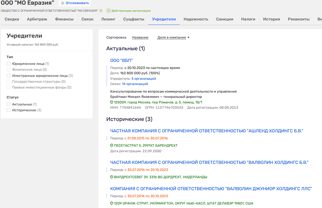 Santerna, что также фигурировала в другой фирме Варданяна, совместной с Бройтманом ООО «ВПБ», не единственный иностранный актив Варданяна. Так, упомянутое ООО «ВПБ» имеет доли в ряде дочерних фирм, в том числе ООО «МО Евразия». Так вот в последнем, до 2023 года наследили нидерландские «АШЛЕНД ХОЛДИНГС Б.В.» и «ВАЛВОЛИН ХОЛДИНГС Б.В.», а также американское «ВАЛВОЛИН ДЖУНИОР ХОЛДИНГС ЛЛС». Бенефициары этих кубышек само собой от публики скрыты.