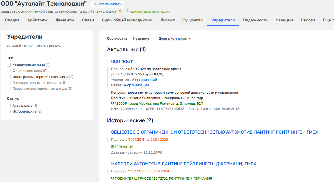 А другое дочернее юрлицо - ООО «Аутолайт Технолоджи» до СВО и вовсе было тесно сплетено с Европой. В биографии актива наследили две фирмы из Германии - АУТОМОТИВ ЛАЙТИНГ РОЙТЛИНГЕН ГМБХ и МАРЕЛЛИ АУТОМОТИВ ЛАЙТИНГ РОЙТЛИНГЕН (ДЖЕРМАНИ) ГМБХ с опять же скрытыми бенефициарами.